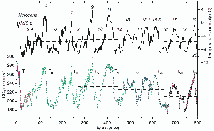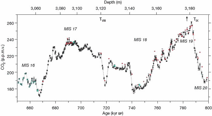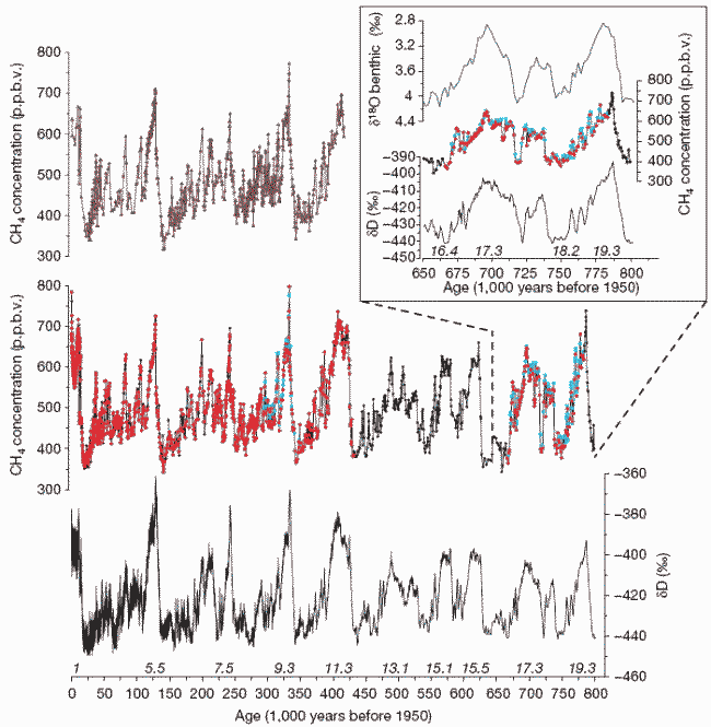 ![]() ミランコヴィッチメニューへ戻る Антарктический лед поведал о содержании метана и CO2 в атмосфере Земли за последние 800 тысяч лет アレクセイ・ギリャロフ 22.05.2008 - ALEXEY GILYAROV 公開:2008年5月22日 抄録 南極の氷柱に封入された気泡を解析することで、過去80万年の大気中の二酸化炭素とメタンの詳細な動態を再構築することが可能になりました。両ガスの濃度は約10万年の周期で周期的に変動していましたが、現在のような高い値になることはありませんでした。 1999年のネイチャー誌には、その科学的な、そして実際に公的な重要性を過大評価することはできないにもかかわらず、メディアの目に留まらない記事がありました。東南極の遠隔地にあるロシアのボストーク観測所で撮影された最長(3000m以上)の氷柱(コア)の解析結果を各国の研究者がまとめた(参照:南極のボストーク氷床コアから過去42万年の気候と大気の歴史を知る // Nature. V. 399. P. 429–436). この氷は、何十万年も前から降水によって形成されたもので、その厚さには気泡が含まれています。実験室でガスの組成を分析することで、科学者たちは実際に、二酸化炭素(CO2)やメタンCH4などの主要な温室効果ガスの過去の含有量を直接の方法で決定することができました。また、異なる氷の層に含まれる重水素-重水素の重同位体の相対的な含有量を推定することで、過去40万年の間に気温がどのように変化したかを追跡することができました(重水素を含む分子では、水蒸気が凝縮する際に通常の水素を含む分子よりも冷却が必要ない)。 写真1 ![]() ヨーロッパ南極観測所「コンコルディア」ドーム「C」にて 静か」(研究室、寝室、診療所)と「騒がしい」(食堂、台所、作業場)の2つの建物があります。冬場は16名、夏場は32名の収容が可能な駅です。年間平均気温:-50.8℃。最低気温:-84.夏の平熱:-30℃、冬の平熱:-60℃。写真は www.concordiastation.org から ボストーク観測所で得られたデータを解析した結果、42万年の間に二酸化炭素とメタンの含有量が同期的に周期的に変化しており、温度でも同じ周期性を示していることがわかった。約10万年ごとに気温の上昇と温室効果ガス濃度の上昇の両方がありました。その後、気温と温室効果ガス濃度の両方が低下し、はるかに長い地球冷却期間が続き、それに伴って氷河の質量が大幅に増加した。過去40万年間の気温と温室効果ガス量の主な周期性は、地球の軌道の規則的な変化、いわゆるミランコビッチ周期によって決定された。 氷河期は、海底堆積物中の重酸素同位体18Oの相対的な含有量という、別の独立した推定値からも判断することができます。この方法は、陸地の大部分が氷で覆われている期間には、通常の軽い酸素同位体-16O-を含む水分子が蒸発し、まず最初に大陸に運ばれるので、海への水の戻りが減少し、残りの水は18Oで濃縮されているという事実に基づいています。海水の同位体組成は、小型プランクトン生物であるコッサイトフォリアや有孔虫の石灰質殻の組成に反映されており、これらの生物は死滅して海底堆積物の形成に関与している。 写真2,3 ![]() Cドームのアイス掘削が終了しました。左は夏の作業テントの様子です。右側では、プロジェクト参加者が数十万年前の氷の破片をシャンパングラスに投げ入れています。膨大な圧力の中で気泡が爆発する。唯一動揺したのは、掘削液として使用されている灯油の臭いだ。写真提供:ギョーム・ダルゴー www.gdargaud.net より ボストーク基地での掘削は、ドリルが亜氷河湖の屋根に近づいたため、1999年に中止されました。しかし、この頃には、南極の他の場所でも氷のサンプリングが始まっていました。最近のプロジェクトの中で最も成功したものの一つがEPICA(European Project for Ice Coring in Antarctica)で、これはフランスとイタリアをはじめとする西ヨーロッパ諸国の研究者の努力を結集したものでした。2005年にプロジェクトの一環として設立されたコンコルディア駅は、いわゆるドームCの上に位置していましたが、ここはボストーク基地周辺よりも風が強くなく、年間降水量も少ないため、毎年形成される氷の層が薄くなっています。ボストク観測所と同じ距離の3200mを掘削することで、80万年という長い時間をかけて形成された氷の柱を得ることができました。ドリルがドームの岩盤にほぼ到達したところで掘削を中止した。 Cドームの氷の分析で最も重要な結果の一つは、過去40万年の重水素と温室効果ガスの変化の過程を確認したことです。それ以前の80万年前から40万年前までの期間については、地球の軌道のパラメータの変化に伴う約10万年分のサイクルも追跡することができます。これまでに得られた海底堆積物の同位体組成のデータは、陸上での氷河の発生と後退の正しい交互性を確認しています。 最新のNature誌に掲載された論文は、65万年前から80万年前までの期間をカバーする下部200mの氷床コアの分析結果に焦点を当てています。当時
