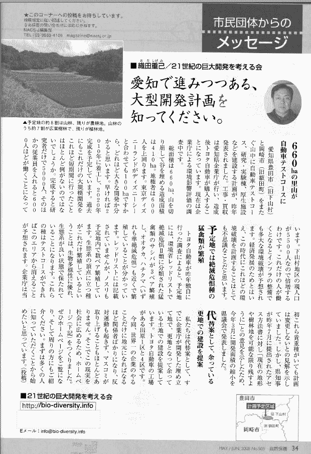 <本件は投稿によるものです> 愛知県豊田市(旧下山村)と岡崎市(旧額田町)の山の中でとんでもないことが行われようとしています。 トヨタ自動車(株)がテストコース、研究棟、実験棟、厚生施設等の建設を計画しているのです。テストコースは2キロの直線コース、6キロの周回路、4キロの周回路など、いくつか造る予定です。現在は環境影響調査(アセス)を実施中です。工事や買収は愛知県企業庁が行い、造成後トヨタが購入することになっています。 問題はその面積と場所です。総面積は660haで、山を切り崩して谷を埋める造成面積は410haです。2010年に着工して2020年の完成を目指していますが、過去にも短期間にこれほど大規模な開発が行われたことは無かったと思います。 ![]() 開発予定地のイメージ 東京ディズニーランドとディズニーシーを合わせても100haしかないことから、そのとんでもない大きさがわかるかと思います。 予定地の環境は約8割が森林で、2割が農耕地です。その森林のうち約7割が里山で、3割が植林地です。 完成すると研究者だけで5000人、その他職員を合わせると6000人ほどが働く計画です。現在下山地区の人口が5500人なので、これだけの人が働くことになるとインフラの整備でもかなりの環境破壊が予想されます。経済の発展のためとはいえ、この時代にこれほどの環境破壊を計画することはとても不思議なことだと思います。 予定地には国の絶滅危惧種で生態系の頂点に立つ猛禽類のサシバ(絶滅危惧U類)やオオタカ(順絶滅危惧)、ハチクマ(順絶滅危惧)などが多数生息しています。 ![]() 現地には猛禽類のサシバ(絶滅危惧U類)やオオタカ (順絶滅危惧)、ハチクマ(順絶滅危惧)などが多数生息 これらの種はテストコースができればこのエリアでは絶滅することになります。企業庁はこれら貴重種がいても計画の変更はしない見解を示しました。 これも時代遅れの発言といわざるをえません。日本ではアセスにより計画が中止や変更になることは何故かありません。 また、今回相手が世界一の企業なだけに反対運動など声をあげる人はいません。地元になればなるほど声をあげづらくなります。そこでこの現実を世の中に広めるためにホームページを作りました。是非ご覧ください。 21世紀の巨大開発の詳細は、以下のホームページにあります。 http://bio-diversity.info |