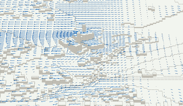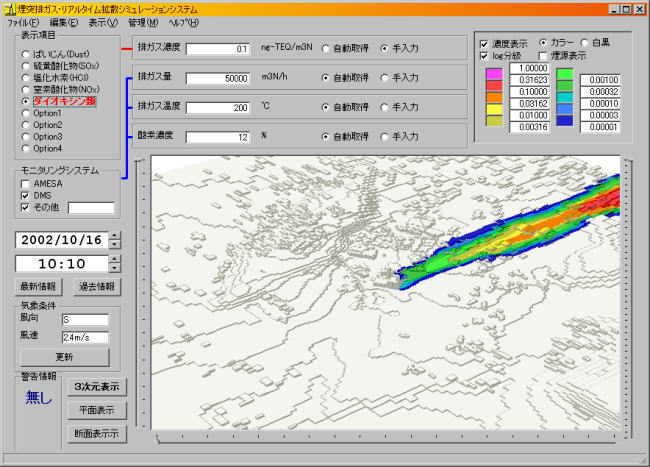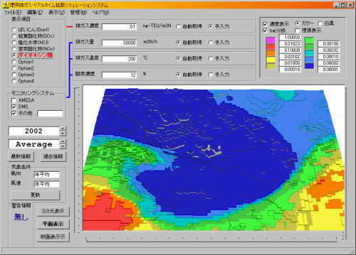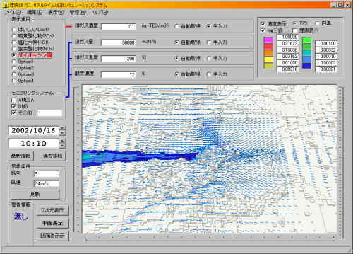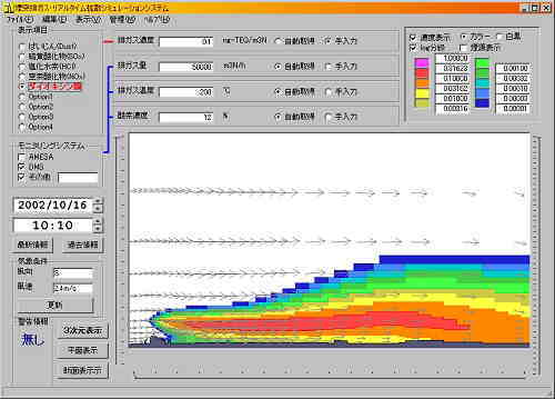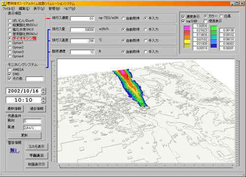 大気汚染濃度分布図(平面図、側面図、立体図)、流況図(平面図、側面図、立体図)、鳥瞰、俯瞰、部分ズームアップ自由自在。 |