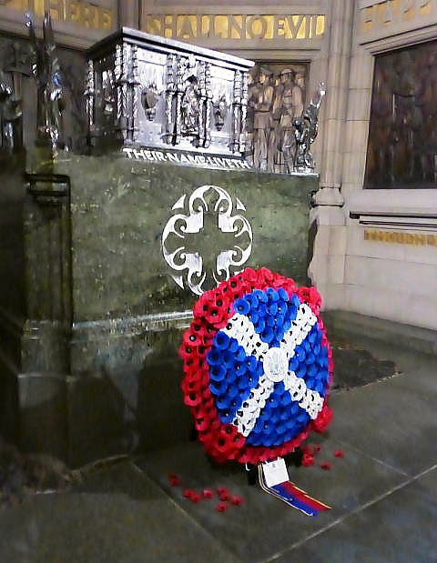 | スコットランド総目次へ* エディンバラ城に入る 外部防御 ポートカリス門とアーガイル塔 ハーフムーンバッテリー 王冠広場と王宮 グレートホール 戦争記念館 聖マーガレット教会堂 アン王女の建物 国立戦争博物館 エディンバラ城の王冠広場(Crown Square)に面して、重要な施設がありますが、以下はそのひとつスコットランド国立戦争記念館(国立戦没者慰霊碑・National War Memorial and War Museum)です。様々な戦争で亡くなった兵士の名を記念する施設です。 ◆スコットランド国立戦争記念館(国立戦没者慰霊碑) (National War Memorial and War Museum) ![]() 撮影:青山貞一 Nikon Coolpix S8 スコットランド国立戦争記念館(国立戦没者慰霊碑)は、エジンバラ城内の王冠広場に面してあり、スコットランドの連隊と連隊兵士の戦没者を祈念しています。この記念館は1927年に正式に開館しています。 この記念館エジンバラ城の中心にある王冠広場(クラウン・スクエア)に再開発された兵舎棟区画(バラック・ブロック)に収容されています。 ![]() 王冠広場にあるスコットランド国立戦争記念館 Source:Wikimedia Commons By Chris Gunns, CC BY-SA 2.0, Link ![]() 王冠広場にあるスコットランド国立戦争記念館の入口 撮影:青山貞一 Nikon Coolpix S8 経過 スコットランド国立戦争記念館創設の提案は、ジョン・ステュワート=マレーおよびキンマーガーメ(Kimmerghame)の大尉ジョージ・スウィントンによって、第一次世界大戦中の1917年に行われました。 帝国戦争グレイブス委員会に関与する建築家の一人であるサー・ロバート・ロリマーが担当として1919年に任命されましたが、大規模な記念館開発への反発がコックバーン協会及びエジンバラ城の遺産関係者から起こされました。 北側の兵舎棟区画(バラック・ブロック)の開発は1923年に最終合意され、記念碑は1927年7月14日にウェールズ公によって正式にオープンされました。 第二次世界大戦後、50,000人の名がその名誉を讃え名簿に追加されました。その後起きた戦争から名前は引き続き追加されますが、記念館自体は変更されていません。 ![]() 北側から見たスコットランド戦争記念館。礼拝堂が見えます。 Source:Wikimedia Commons CC BY 3.0, Link ボーンによるガーゴイル(ゴシック建築で怪物の像に作ったもの、樋嘴(ひはし))と彫刻が施されています。一方で、インテリアには、個々の連隊を記念した精巧な壁のモニュメントがあります。ステンドグラスの窓はDouglas Strachanによるものです。 記念碑の背後にある当初の目的は、スコットランド人と第一次世界大戦で死亡したスコットランド連隊に仕えた人々で、1914年8月4日の戦争宣言から1919年6月28日のベルサイユ条約までを記念することでした(軍事的自殺と、自殺未遂、処刑された人々は除く)。 床から突きだしているキャッスル・ロックの最も高い部分に置かれた神社の祭壇には、ホール内で公開されている名簿とともに、第一次世界大戦で殺害された兵士147,000名余の人々の栄誉を讃える「名誉の名簿」が入った封印された箱(棺)が設置されています。 第二次世界大戦後、(名簿に記載される人々の兵役)時期の制約が変更され、ホール内の名誉の名簿には50,000の名前が追加され、その後もさらに名前が追加され続けました。この記念碑は、スコットランド国立戦争記念館(Scottish National War Memorial)として知られる公益団体によって維持されています。 ![]() 1927年の開会式で設置された14万7000人以上の名誉を持つオリジナルの名簿を含む棺 Source:Wikimedia Commons CC BY-SA 4.0, Link 「聖マーガレット教会堂」につづきます スコットランド総目次へ* |