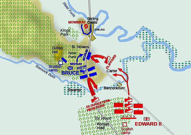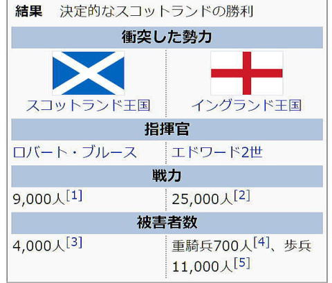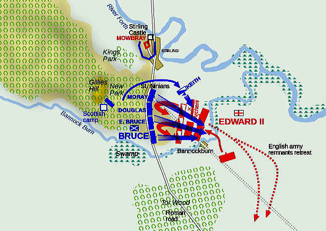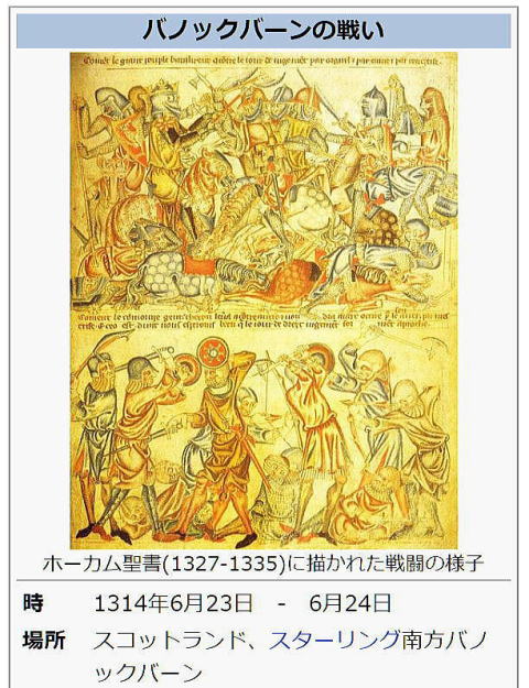 | スコットランド総目次へ* 闘いと苦難の歴史 ウォレス・モニュメント ウィリアム・ウォレス スターリングブリッジ戦場 ロバーツ・ブルース バノックバーン戦場 スターリング大学 スコットランドの偉人 スコットランド人の独創性 ◆出典、翻訳等について 本稿では、現地調査時に入手した資料、撮影した写真以外に、概要、歴史などでは日本語、英語のWikipediaを、また写真についてはWikimedia Commonsを、さらに地図についてはグーグルマップ、ストリートビューを使用しています。その以外については逐次出典を付けています。さらに、Wikipedia の英文版など外国語版などについては、逐次池田、青山が日本語訳しています。 スコットラドがイングランドに勝利したバノックバーンの戦場は、スターリング城から車でわずか10数分、南に行ったところにあります。この戦場はウォレス・ナショナル・モニュメントのタワーの上からよく見えます。 現在は、閑静な住宅地ですが、スコットランド人にとっては、このバノックバーンという言葉は心を震わせる響きを持っているといえます。 ◆バノックバーンの戦場 出典:グーグルマップ ◆バノックバーンの戦いの概要 バノックバーンの戦い(Battle of Bannockburn )は、今から700年以上前の1314年6月24日、スコットランド王国とイングランド王国の間で行われた会戦の場所を指します。 スコットランドに侵攻したエドワード2世率いるイングランド軍が、スターリング近郊でロバート1世とスコットランド軍と戦い、大敗し、その結果、永年イングランドの暴政に苦しめられてきたスコットランドが初めてイングランドから独立を勝ち取るきっかけとなった場所なのです。 下図より明らかなように、スコットランド軍は2倍以上の戦力をもつイングランド軍に勝利しています。犠牲者はスコットランド側が4000人、イングランド側が11000人となっています。 ![]() ![]() Source:Wikipedia ◆バノックバーンの戦いの背景 1272年に王座についたエドワード1世はイングランドの最も偉大な戦士王の一人であり、ウェールズの征服者、また「スコットランドへの鉄槌」であることを周囲に示していました。 エドワード1世はウェールズ戦争での経験から弓兵の価値を確信し、王国全土から多数の弓兵を募りました。 イングランド軍による1296年のスコットランド侵攻では、エドワード1世がフランスとの戦いで不在のときにウィリアム・ウォレスの地形を利用した戦術に敗れました(1297年、スターリング・ブリッジの戦い)が、1298年のファルカークの戦いでは重装騎兵と弓兵の連携によってスコットランド軍を撃破しました。 当時のスコットランド軍はシルトロン隊形を保つ大勢の槍兵と、剣と円盾を持つ兵で構成されていましたが、装備は貧弱でイングランド軍と正面から激突するには限界があったからです。ファルカークの戦いによって大惨敗を喫したスコットランド軍は、ロバート1世も服従の申し出をしなければならない状況になり、エドワード1世は戦略的に重要な拠点であるスターリング城を占拠しました。 その後、ロバート・ブルースはイングランドへの服従と反乱を繰り返し、一時はラスリン島に逃げるまで追い詰められましたが、1307年にエドワード1世が死去すると、急速に勢力を盛り返してスコットランド全土で権威を確立しました。 エドワード1世の後を継いだエドワード2世は父の軍才を受け継いでおらず、決戦を避けてゲリラ戦術を駆使し、孤立した城を占領するロバート1世の戦略の前に後手に回りました。1314年にスコットランド軍がスターリングを包囲する状況に陥ると、エドワード2世は大軍を編成してスターリングの救援に向かいました。 バノックバーンはスターリング城の南西に位置し、名称が意味する「小川」や池がいくつもある湿地帯であり、南側(イングランド側)からスターリング城へ向かうには、ここを通過する必要がありました。 ◆バノックバーンの戦いの経過 エドワード2世はウェールズ、イングランド中部、北部諸州から2万を超える軍を召集しました。主力となるのは弓兵と重装騎兵であり、この二つはスコットランド軍に対して優位を誇っていました。 一方、ロバート1世も1万の軍勢を率いていましたが、その大半が歩兵で騎兵は数百人しかいませんでした。ロバート1世は数的不利と味方の脆弱さを補うために、戦場をバノックバーンに選びました。また、イングランド軍の重装騎兵に対抗するため、小さな落とし穴を幾つも掘らせました。 1日目 イングランド軍は南西の方向からローマ街道に由来する道を進み、バノックバーンの野原に軍を展開しました。対峙するスコットランド軍はロバート1世自身が陣頭に立って、騎兵で構成されたイングランド軍の先鋒に応戦しました。このとき、ロバート1世はイングランド軍のヘンリー・ド・ブーンと一騎討ちを行い、自らの戦斧でヘンリーを討ち取っています。 戦意の低い歩兵主体のスコットランド軍は、ロバート1世の英雄的な行
