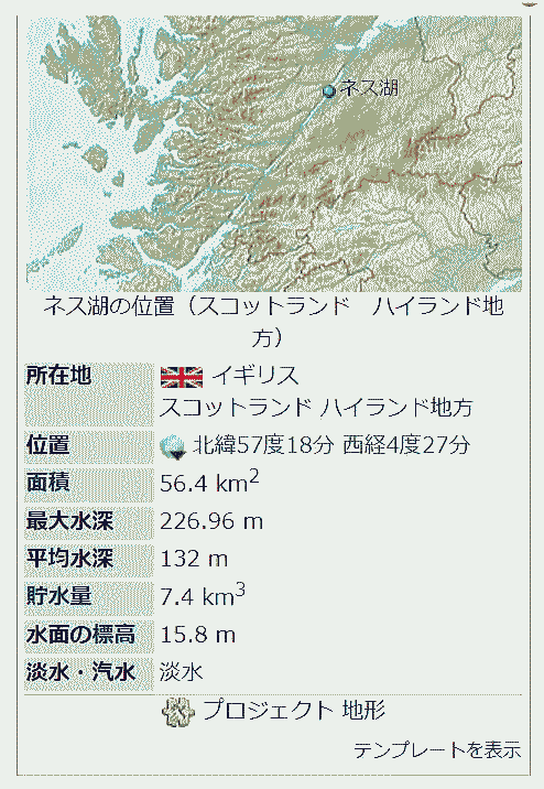 ![]() Source:Wikipedia ![]() ネス湖 Source: Wikimedia Commons , CC BY-SA 3.0, Link ![]() 前景にアーカート城とネス湖の風景 Source: Wikimedia Commons By Sam Fentress, CC BY-SA 2.0, Link ![]() ネス湖;左下にアルフレッド・ドゥ・ブレンスキのサインがあります。 裏面には、絵の題名と書名が刻まれています。キャンバス上の油絵。 61×91.5cm Source: Wikimedia Commons , Public Domain, Link ネス湖( Loch Ness ロッホ・ネス、スコットランド・ゲール語: Loch Nis )は、イギリス・スコットランド北部ハイランド地方にあり、イギリス最大の淡水湖です。 長さが約35km、幅約2kmの非常に細長い湖。水深は最大で約230m。ラムサール条約登録地でもあります。 インヴァネス(ネス川の河口を意味する)の南西約10kmに位置します。 岸辺には13世紀に建てられ17世紀に破壊されたアーカート城の廃墟があります。 ・所在地 スコットランド ハイランド地方 ・面積 56.4 km2 ・最大水深 226.96 m ・平均水深 132 m ・貯水量 7.4 km3 ・水面の標高 15.8 m ・淡水・汽水 淡水 ![]() アーカート城の上から眺めたネス湖 Source: Wikimedia Commons CC 表示-継承 3.0, リンクによる 「ネッシー」につづきます スコットランド総目次へ* |