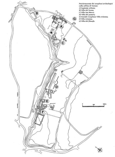 <ヴェスヴィオ総合メニュー>![]() カステッランマーレ・ディ・スタービア( Castellammare di Stabia) Source:Wikimedia Commons CC 表示-継承 4.0, リンクによる カステッランマーレ・ディ・スタービア(コムーネ) スタビアエ遺跡1 スタビアエ遺跡2 スタビアエ遺跡3 スタビアエ遺跡4 スタビアエ遺跡5 スタビアエ遺跡6 スタビアエ遺跡7 スタビアエ遺跡8 スタビアエ遺跡9 スタビアエ遺跡10 スタビアエ遺跡11 スタビアエ遺跡12 本稿の解説文は、現地調査に基づく解説、写真撮影に加え、Wikipediaのイタリア語版を中心に英語版からの翻訳及び日本語版を使用しています。また写真は現地撮影分以外にWikimedlia Commons、さらに地図はグーグルマップ、グーグルストリートビューを使用しています。その他の引用に際しては、その都度引用名をつけています。 ◆スタビアエ遺跡2 スタビアエの街は今も明確にその場所に存在していますが、同盟市戦争(紀元前91~88年)においてローマ人との紛争が頂点に達したとき、ローマの将軍スッラが紀元前89年4月30日に単に占領しただけでなく、町を破壊したという事実のために、この街は、おそらく重要な要塞都市となりました。 場所は、スカンザノ峡谷とその壁を部分的に侵食したサンマルコ川によってその範囲が定められていると言われています。 注)同盟市戦争(英: Social War、羅: Bellum Sociale) Wikipedia 紀元前91年から紀元前87年にかけて、都市国家ローマと同盟 を結んでいたイタリア各地の都市国家や部族が、ローマ市民権 を求めローマに対し蜂起した戦争である。「ローマ連合」は実質 的には一つの国として機能していたため、戦争というより内戦 に近い。 ローマ時代 ![]() スタビアエでの発掘調査の地図 Source:Wikimedia Commons CC BY-SA 4.0, Link ローマの作家で提督のプリニウス長老は、同盟市戦争後に町が再建され、裕福なローマ人に人気のリゾートとなったと記録しています。彼は、岬の端に沿って数マイルにわたり豪華な別荘が建てられ、それぞれの別荘から、湾を一望する景色を楽しむことができたと報告していました。今日訪れることができる別荘は、紀元前89年のスッラによるスタビアエの破壊から西暦79年のベスビオ山の噴火までの時期に出来たものです。 1759年、カール・ウェーバー(Karl Weber)は、サン・マルコ邸近くで、全体では約45000平方メートルの広さに及ぶ都市の一部を特定して解説しました。彼は、直角に交差する5つの舗装された通り、公開広場、基壇上の寺院、運動場、アーケードのある店舗、歩道、小さな民家などを発見しました。 注)タベルナ(Taberna) Wikipedia(en) タベルナは古代ローマの一種の店または屋台でした。もとも と商品やサービスを販売するためのシングルルームショップ を意味していましたが、Tabernaeは、家の正面玄関である蛇 口に隣接する1階の住宅に組み込まれていました。 スタビア周辺の平原には、市が管理する土地で、約60の農村集落郊外の街(villae rusticae)が確認されているStabiaeの農場地帯(Ager Stabianus)がありました。農家はそれぞれ400~800平方メートルの大きさで、肥沃な土壌を利用して集中的な農業が行われていました。そこでは、主にワインやオリーブの圧搾、小麦の脱穀と貯蔵などの農産物の生産、加工が行われ、別荘地の温泉とフレスコ画が描かれた部屋などから考えると、農家は裕福であったと思われます。 こうしてスタビアエは高級住宅地としての地位を確立したため、シセロ(Cicero)は友人のマーカス・マリウス・グラティディアヌス(Marcus MariusGratidianus)に手紙を書きました: 「あなたがお勉強するときに、スタビア湾に向いた窓を開けナポリ湾のスタビア海に窓を開けてミセヌム(Misenum)の景色を独り占めにした時、あなたは当時の朝の時間を軽い読書で過ごしたに違いありません。」 注)ミセヌム(Misenum) イタリア南部のカンパニア州ナポリ県にある港町である。現在 はミゼーノと呼ばれ、コムーネのバーコリに属するフラツィオー ネである。ミセヌムはナポリ湾の北西部の岬にある。 この時期にナポリ湾の海岸全体に沿って豪華な別荘が建設されたという現象については、ストラボンも次のように書いています: 「湾全体は都市、建物、農場がまるでキルティングされてように相互に連なっているので、あたかもひとつの大都市のように見えます。」 スタビアエはまた、コルメラ(Collumella)によると薬効があると信じられていた湧き水の水質でよく知られていました。スタビアエはその泉でも名を馳せました。 注)コルメラ(Collumella) Wikipedia(en) Lucius Junius Moderatus Columellaは、ローマ帝国の農業に 関する著名な作家でした。 彼の12巻の「農業」(De re rustica) は完全に保存されており、大カト(Cato the Elder)とVarroの作 品とともに、彼は時々引用するローマの農業の重要な情報源と なっています。 注)大カト=マルクス・ポルキウス・カト・ケンソリウス Wikipedia (ラテン語: Marcus Porcius Cato Censorius (M. Porcius M.f. Cato)、 紀元前234年 - 紀元前149年)は共和政ローマ期の政治家。清 廉で弁舌に優れ、