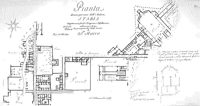 ![]() カステッランマーレ・ディ・スタービア( Castellammare di Stabia) Source:Wikimedia Commons CC 表示-継承 4.0, リンクによる <ヴェスヴィオ総合メニュー> カステッランマーレ・ディ・スタービア(コムーネ) スタビアエ遺跡1 スタビアエ遺跡2 スタビアエ遺跡3 スタビアエ遺跡4 スタビアエ遺跡5 スタビアエ遺跡6 スタビアエ遺跡7 スタビアエ遺跡8 スタビアエ遺跡9 スタビアエ遺跡10 スタビアエ遺跡11 スタビアエ遺跡12 スタビアエ遺跡13 スタビアエ遺跡14 スタビアエ遺跡15 本稿の解説文は、現地調査に基づく解説、写真撮影に加え、Wikipediaのイタリア語版を中心に英語版からの翻訳及び日本語版を使用しています。また写真は現地撮影分以外にWikimedlia Commons、さらに地図はグーグルマップ、グーグルストリートビューを使用しています。その他の引用に際しては、その都度引用名をつけています。 ◆スタビアエ遺跡3 考古学 スタビアエ遺跡は、1749年、ナポリのカルロス7世王のために働いていたエンジニアであるキャバリエール・ロコ・デ・アルキュビエレ(Cavaliere Rocco deAlcubierre)によって最初に発見されました。これらの遺跡は、1749年から1775年の間にカールウェーバーの助けを得てアルキュ・ビエレが部分的に発掘しました。 ウェーバーは最初に詳細な建築図面を作成し、ナポリの裁判所に提出しました。 彼は、建物を体系的に発掘し、発掘現場の環境の中での展示を提案しました。1759年、ウェーバーは約45000平方メートルの面積に広がる旧市街の一部について、部分的に明らかにしましたが、発掘された遺跡は埋め戻されました。 ![]() 図 Plan of part of the town of Stabiae, (Villa San Marco top right) スタビアエのまちの部分的な地図(平面図)(右上がサン・マルコ別荘/大邸宅) Source:Wikimedia Commons Public Domain, Link ウェーバーの死後、1782年までの2回目の発掘活動は、建築家フランチェソ・ラ・ベガ(Franceso La Vega)の支援を得て行われました。彼は発掘の歴史を再構築するために、これまでのすべての資料を熱心に収集しました。彼は、(現場の)状況/環境についての新しい概念を初めて紹介し、その風景、あるいはその歴史的、考古学的な複合体のなかに存在する古代の建築物を直接観察することの意味を強調しました。スタビアエでの7年間で、ラ・ベガ(La Vega)はすでに部分的に発掘された複数の別荘、具体的には、パストーレ邸(Villa delPastore)、アリアナ邸(Villa Arianna)そしてセカンド・コンプレックス(Second Complex)で発掘を再開し、調査を多数の郊外の田舎町や農村地域にまで拡大し、詳しい報告を行いました。しかし、彼は発掘された建物を露出させたままにして、埋め戻しをしないようにと、裁判所を説得することができなかったため、結局、スタビアエの発掘は掘削して埋め戻すという通常の技術で続けられることになりました。結果として、スタビアエの発掘現場(遺跡)は再び全くといってよいほど忘れられていました。 ![]() Spring fresco from the Villa Arianna, Stabiae アリアナ邸から発掘された春を描いたフレスコ画 Source:Wikimedia Commons Public Domain, Link 1950年、熱狂的なアマチュア(考古学マニア)のリベロ・ドルシ(LiberoD'Orsi)が、ブルボン発掘調査の地図の助けを借りて、サン・マルコ邸とアリアナ邸のいくつかの部屋を明るみに出し、また、1957年にペトラーロ邸住宅(Domus)も偶然発見しましたが、数年の研究の後、これらの発掘現場は埋め戻されてしまいました。彼はまた、サン・マルコ邸から300メートルほど離れたところの住宅街の一部を発見しました。 その中には、家屋、商店、港からの道路が合流する市場の一部の遺跡なども含まれていました。 これらの遺跡は再び埋め戻されましたが、発見のニュースはすぐにヨーロッパ中から重要な訪問者と貴族を引き付けることとなりました。最も貴重なフレスコ画のいくつかは、より良い保存を確保するために切り離され、約9000点にものぼる発見した品々は地元に収蔵されました。最終的に、彼の仕事は資金不足の後、1962年に停止しました。 その後も散発的に、別荘や墓地遺跡が数多く発見されました。カルミアーノ邸が1963年に発掘され、その後埋め戻されたのもその一つです。1967年に「セカンド・コンプレックス」の一部とパストーレ邸が再び注目されましたが、1970年に再び埋め戻されました。1974年、現在のサンタントーニオ・アバーテ市(Sant'AntonioAbate)で発掘調査が完了していない、農村地帯に属する別荘が発見されました。 さらに、他の別荘、特に郊外の農村部の別荘について、特にサンタ・マリア・ラ・カリタ(Santa Maria ぁCarita)とグラニャーノ(Gragnano)の間の農場地帯全体での発掘が行われましたが、すべてが埋め戻されました。 1980年、イルピニア(Irpinia)の激しい地震により、別荘は甚大な被害を受け、サン・マルコ邸の上部回廊(ペリスタイル)の列柱の一部が破壊されました。それによって、一般の人々による発掘作業は中止となってしまいました。しかし、そうしたなかでも、1981年にアリアナ邸の中庭の一部が発見