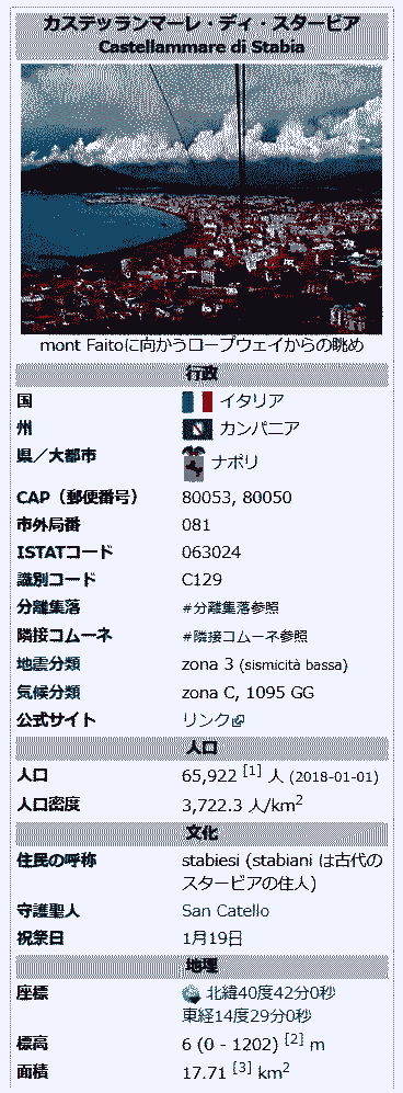 ![]() カステッランマーレ・ディ・スタービア( Castellammare di Stabia) Source:Wikimedia Commons CC 表示-継承 4.0, リンクによる <ヴェスヴィオ総合メニュー> カステッランマーレ・ディ・スタービア(コムーネ) スタビアエ遺跡1 スタビアエ遺跡2 スタビアエ遺跡3 スタビアエ遺跡4 スタビアエ遺跡5 スタビアエ遺跡6 スタビアエ遺跡7 スタビアエ遺跡8 スタビアエ遺跡9 スタビアエ遺跡10 スタビアエ遺跡11 スタビアエ遺跡12 スタビアエ遺跡13 スタビアエ遺跡14 スタビアエ遺跡15 本稿の解説文は、現地調査に基づく解説、写真撮影に加え、Wikipediaのイタリア語版を中心に英語版からの翻訳及び日本語版を使用しています。また写真は現地撮影分以外にWikimedlia Commons、さらに地図はグーグルマップ、グーグルストリートビューを使用しています。その他の引用に際しては、その都度引用名をつけています。 ◆カステッランマーレ・ディ・スタービア(コムーネ) ![]() Source:Wikipedia カステッランマーレ・ディ・スタービア( Castellammare di Stabia)は、イタリア共和国カンパニア州ナポリ県にある、人口約6万6000人の基礎自治体(コムーネ)。 古くから保養地として知られ、名曲『フニクリ・フニクラ』誕生の地でもある。 地理 ナポリ県概略図 ![]() ナポリ・ヴェスヴィオ・ロードマップ Source:Wikimedia Commons CC 表示-継承 3.0, リンク 位置・広がり ナポリ県南東部に位置するコムーネ。ソレントから北東へ約15km、サレルノから西へ約24km、州都・県都ナポリから南東へ約25kmの距離にある。 隣接コムーネ 隣接するコムーネは以下の通り。 ・トッレ・アンヌンツィアータ - 北 ・ポンペイ - 北 ・サンタ・マリーア・ラ・カリタ - 北東 ・グラニャーノ - 東 ・ピモンテ - 南東 ・ヴィーコ・エクエンセ - 南西 行政 分離集落 カステッランマーレ・ディ・スタービアには、以下の分離集落(フラツィオーネ)がある。 Fratte, Madonna della Libera, Pioppaino, Ponte Persica, Pozzano, Privati, Quisisana, Scanzano, Varano 注)分離集落とは 分離集落(イタリア語、フラツィオーネ( frazione)は、イタリアの 地方行政上の制度で、基礎自治体であるコムーネの下位にあ たる行政区画。 コムーネに含まれるが、コムーネの中心集落 (it:Capoluogo) から地理的・歴史的・経済的に離れている村落 (集落)である。 社会 条例 2010年3月から2012年12月まで市長を務めた、自由国民(中道右派)所属で元判事のルイジ・ボッビオ市長 (it:Luigi Bobbio (politico)) は、ユニークな条例を作る人物として知られています。 2010年10月には「(街の)品位を取り戻すため」として、女性が街で露出的な服装(ミニスカートや、胸元が大きく開いた衣装)を着ることを禁止する条例案を示し、イタリア国内外で「ミニスカート禁止令」などとして大きく報じられましsた。 条例ではほかに「ジーンズを尻の一部が見えてしまうほど低い位置ではくこと」や「公共の公園でのサッカー」「教会に対する侮辱」なども禁止されました。 これに対して地元カトリック教会が歓迎の姿勢を示す一方、野党の女性議員らは「女性の自由を束縛する」と猛反発を示しました。条例案は市議会で可決され、違反者には最大500ユーロの罰金が科せられることとなりました。 スポーツ プロサッカークラブとして、SSユーヴェ・スタビアが本拠を置く。SSユーヴェ・スタビアのホームスタジアムはスタディオ・ロメオ・メンティで、2013-14シーズンはセリエB(2部リーグ)に所属しています。 人物 著名な出身者 ・ルイージ・デンツァ - 作曲家。「フニクリ・フニクラ」の作曲で知られています。 ・ファビオ・クアリャレッラ - サッカー選手。 ・アントニオ・ミランテ - サッカー選手。 ・ブルーノ・チリッロ - サッカー選手。 ・ジャンルイジ・ドンナルンマ - サッカー選手。 ゆかりの人物 ・アル・カポネ - 家族はカステッランマーレ・ディ・スタービアの出身。 スタビアエ遺跡1へつづく |