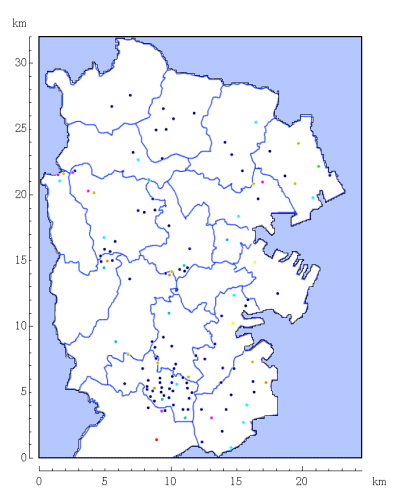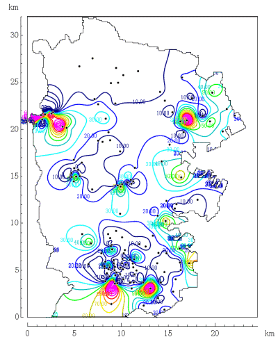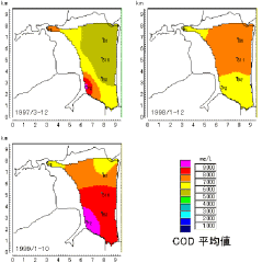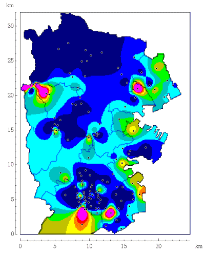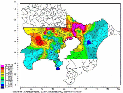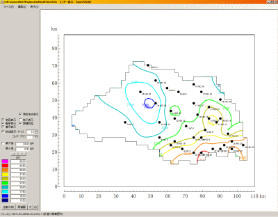 ![]() マウスで測定データの座標および数値入力 (数値の色別表示例) (数値入力画面は左フローチャート下図参照) ![]() スプライン補間計算結果 カラーメッシュ表示例 ![]() スプライン補間計算結果 カラーコンター表示例 ![]() スプライン補間計算結果 3次元シンプル表示例 ![]() スプライン補間計算結果 3次元陰影表示例 ![]() 二酸化窒素の濃度分布(一般環境大気測定局) スプライン補間結果 カラーコンター(等濃度線)表示例 ![]() 1999年度市民参加による松葉中ダイオキシン類濃度地図 なくせ!「ダイオキシン汚染監視運動」実行委員会調査(事務局:環境総合研究所)より