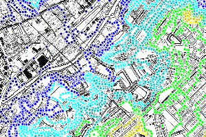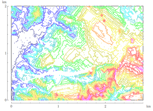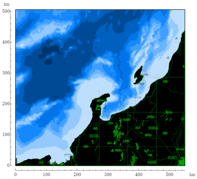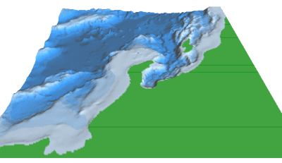 ![]() 地図上の標高データから地形データを作成した事例 ![]() ![]() 日本海海底地形構築の例 既存の水深データに不足分を海図の等高線により補い、日本海地形データを作成、潮流シミュレーションに活用した例 |