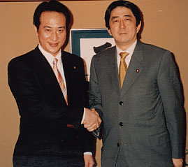 | 折口会長としっかり握手する安部晋三官房副長官(当時)