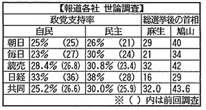 鳩山 43%、麻生 32% 緊急調査の首相適格共同通信