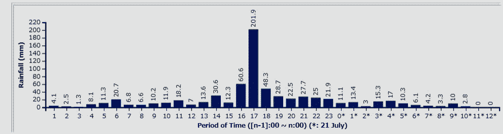 | 2021年7月20日0:00から7月21日12:00までの鄭州の1時間ごとの降雨量 Source:English Wikipedia |