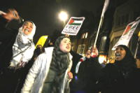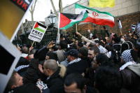 | ロンドンのイスラエル大使館の外で抗議するデモ隊Independent Media Center |