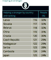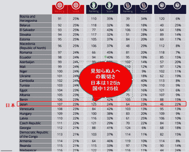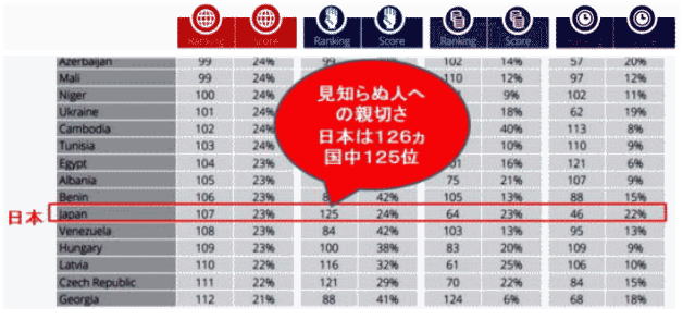 | ◆英国CAF「見知らぬ人への親切さ」10年調査、日本人126ヵ国中125位 |
